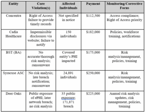 - OCR settled alleged Privacy Rule Right of Access violations after determining Concentra failed to provide an individual's PHI within 30 days despite multiple requests; access was ultimately provided more than a year after the initial request. The matter concluded prior to hearing with a $112,500 payment and a settlement agreement. This marked OCR's 54th Right of Access enforcement action. Risk takeaway: failure to meet the 30‑day Right of Access standard (plus one possible 30‑day extension) is a continuing OCR priority and is likely to trigger investigation and monetary settlement.